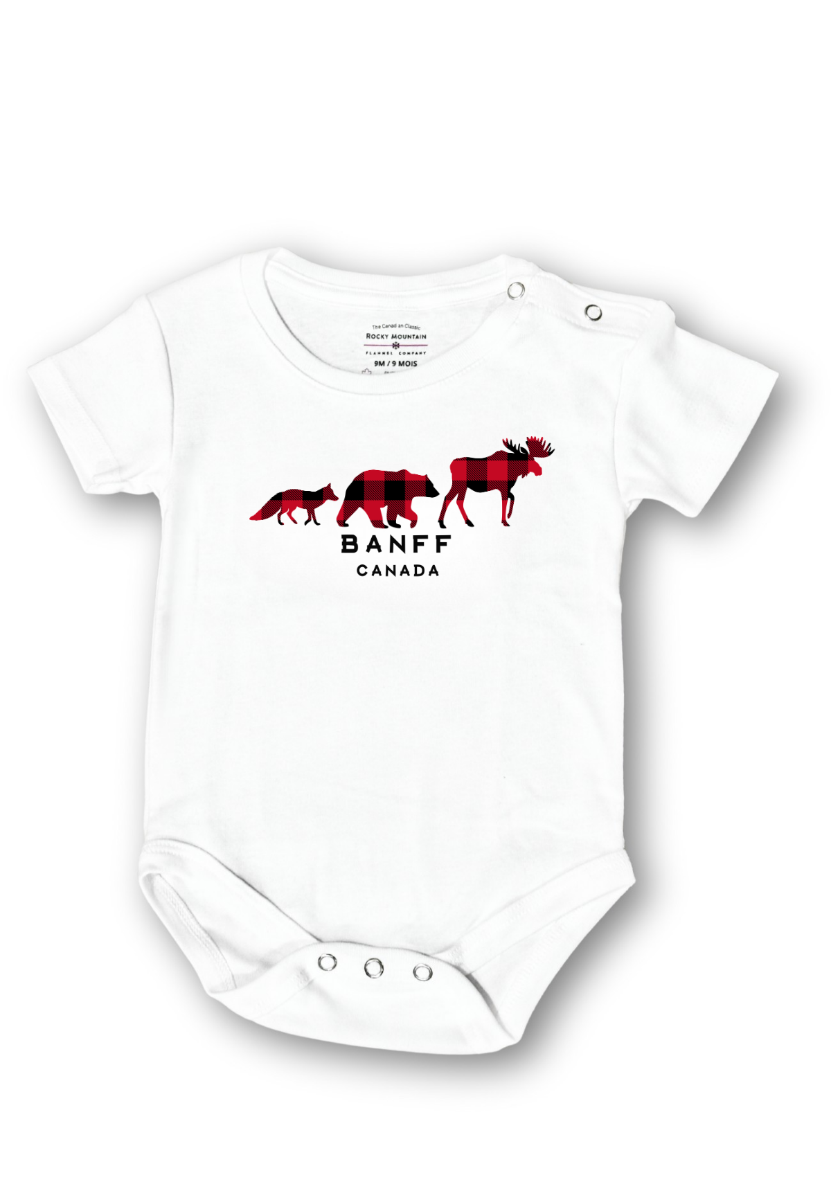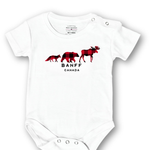 Bring a touch of the Canadian Rockies to your little one's wardrobe with our Banff Baby Onesies. A cozy, unisex baby bodysuit made from 100% cotton. The design features three famous Canadian Animals - Moose, Bear and a Fox.