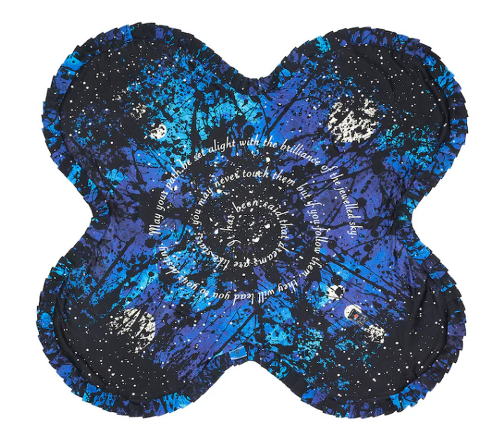 The stars have been used traditionally by travellers to guide their path of journey. The North Star located directly above the North Pole never moves where the moon is constantly changing. The Star Blanket was inspired from the jewelled stars that softly blanket the earth at night.
