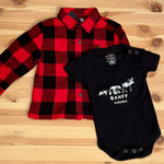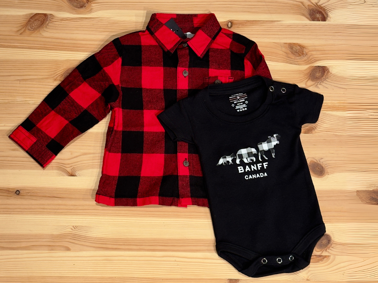 Our kids classic red black buffalo check shirt pairs perfectly with the Banff Baby Onesie, creating the ultimate Classic Canadian look!