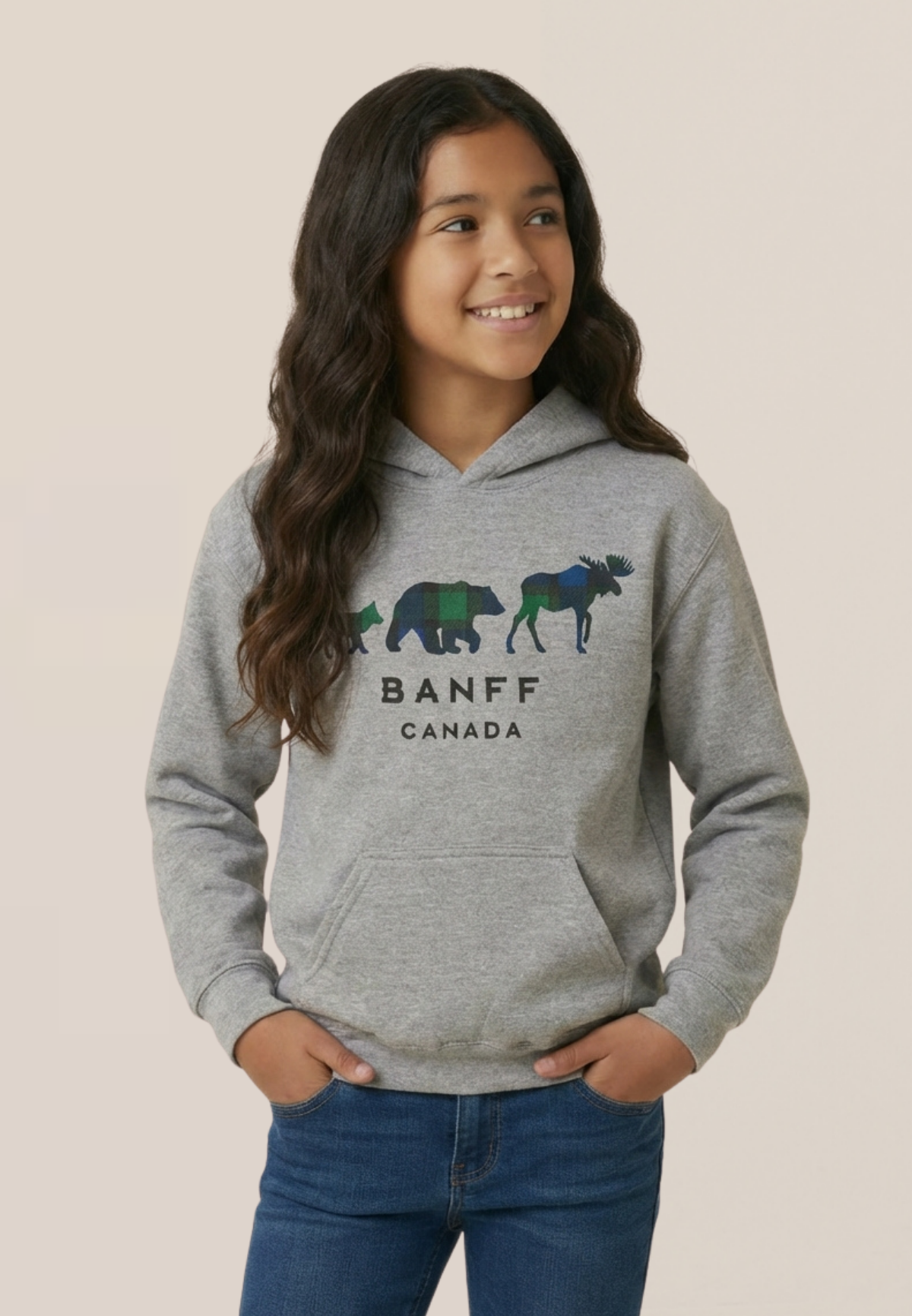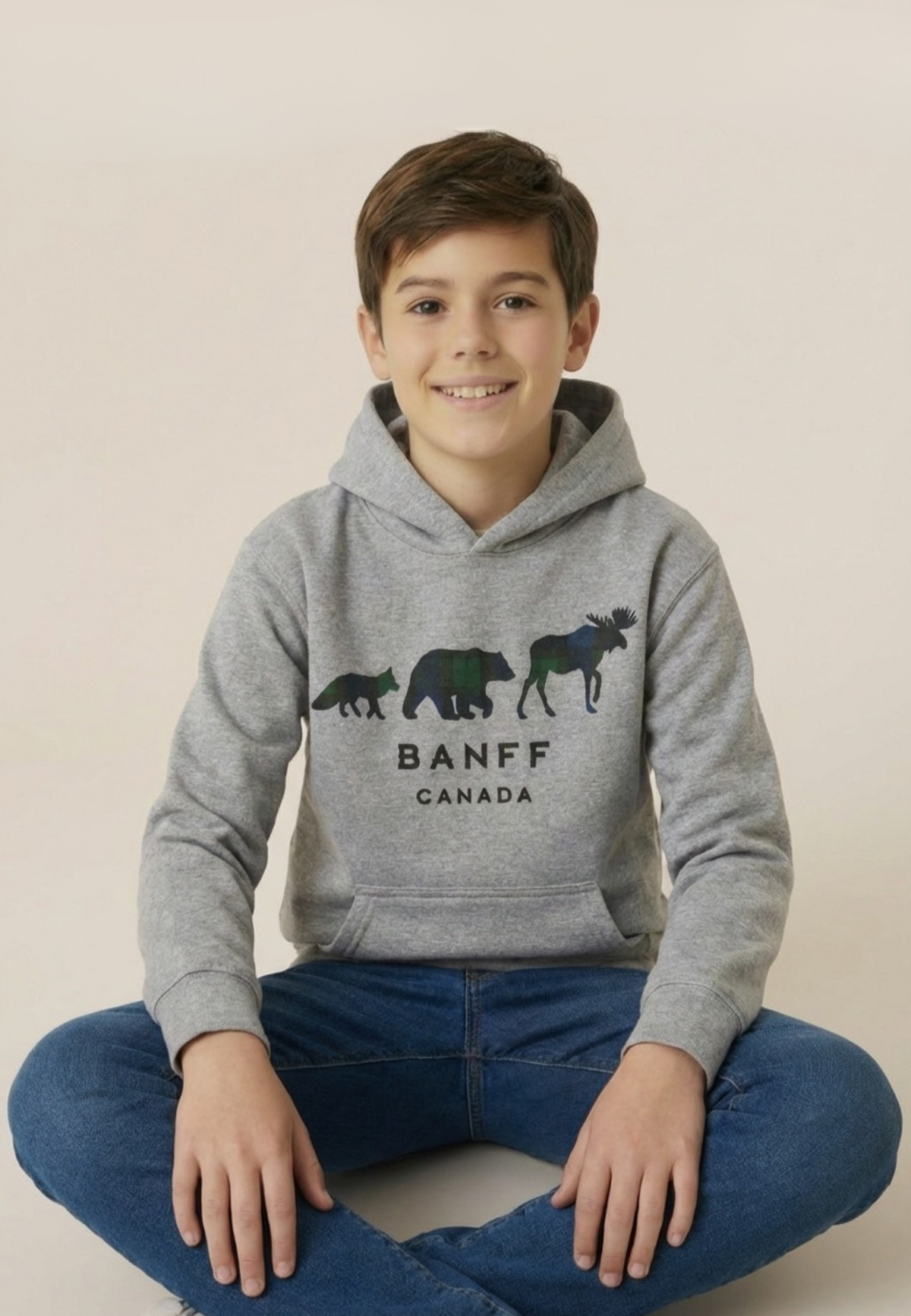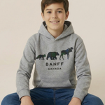 A cozy kids hoodie featuring three iconic Canadian animals - Moose, Bear and Fox. Made from a soft cotton-blend fleece with a kangaroo pocket and hood for extra warmth. The perfect memory of your banff trip or layer for any adventure!
