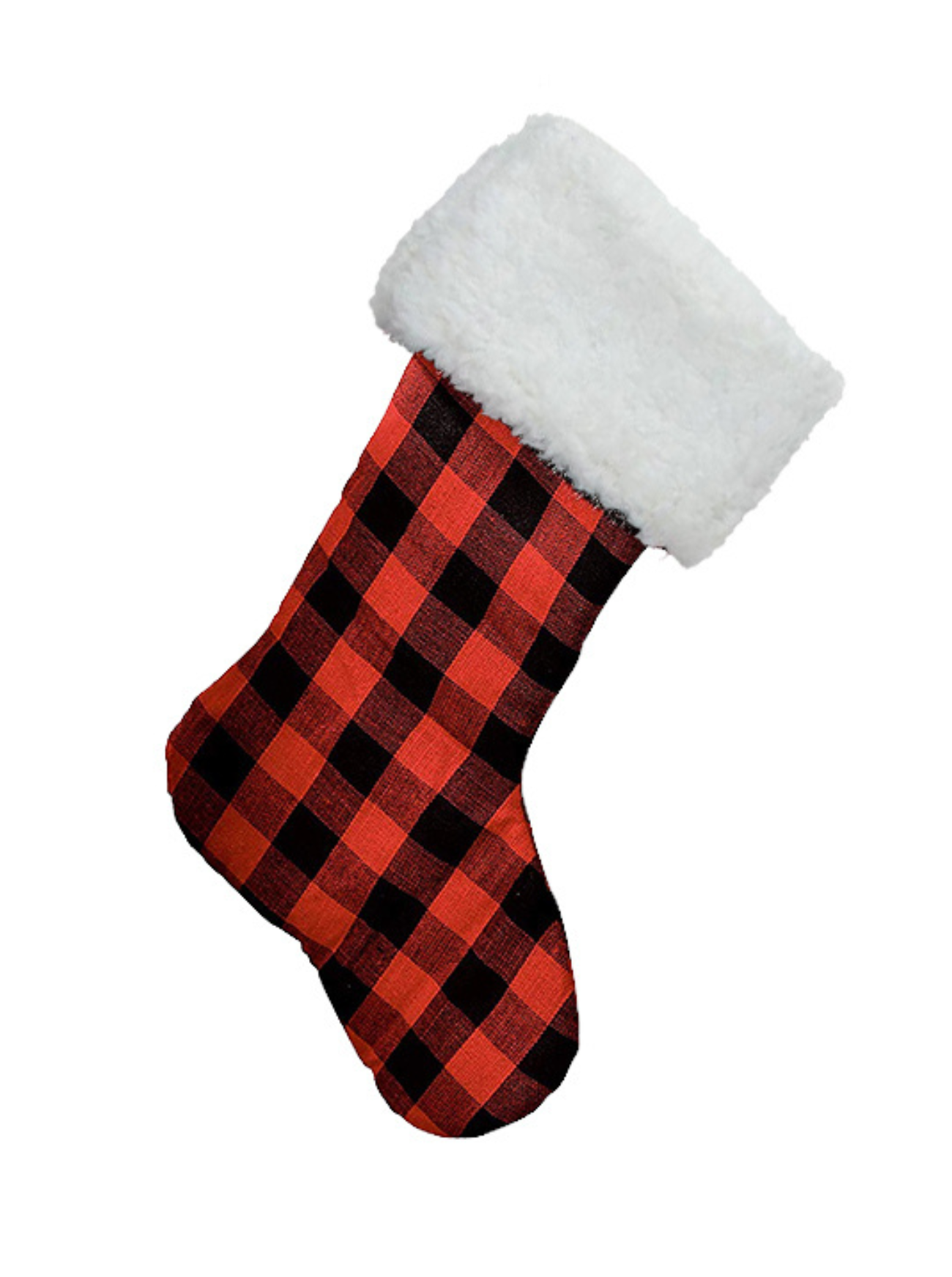Red Black Buffalo Check with White Fur Christmas Stocking